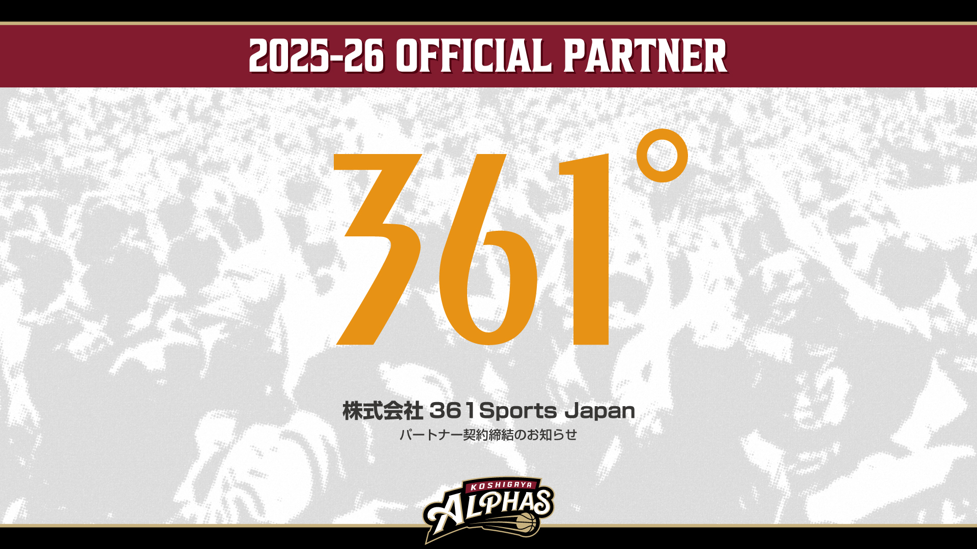 いつも越谷アルファーズを応援いただき誠にありがとうございます。 この度、越谷アルファーズは、株式会社361Sports Japan(東京都台東区)と2025-26シーズンの新規パートナー契約を締結いたしましたのでお知らせいたします。 パートナー企業 詳細 株式会社361Sports Japan 所在地 東京都台東区上野 1-16-5 代表取締役 林 光 事業内容 スポーツブランド「361°」の販売 創業年月 2025年1月 公式サイト https://361sports.jp/