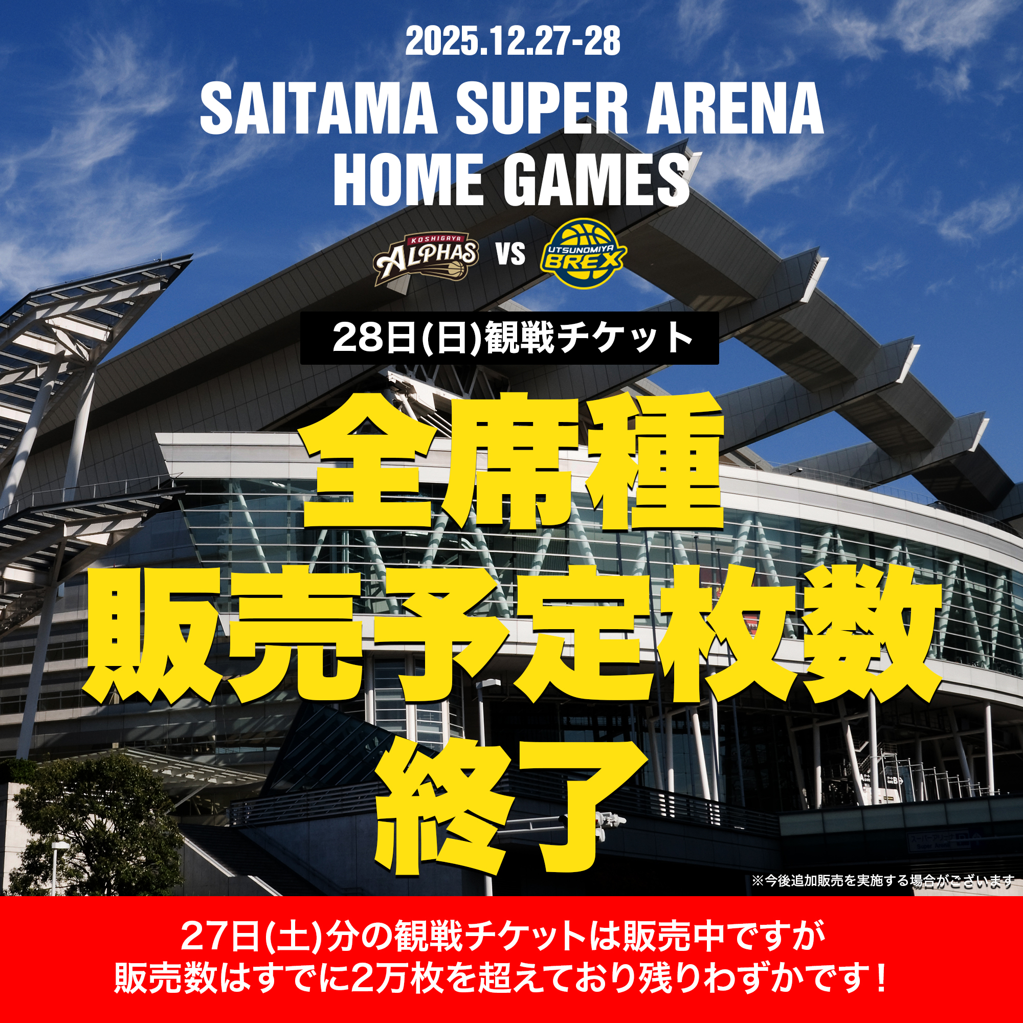 【12/28(日)vs宇都宮】”全席種 販売予定枚数終了”のお知らせ