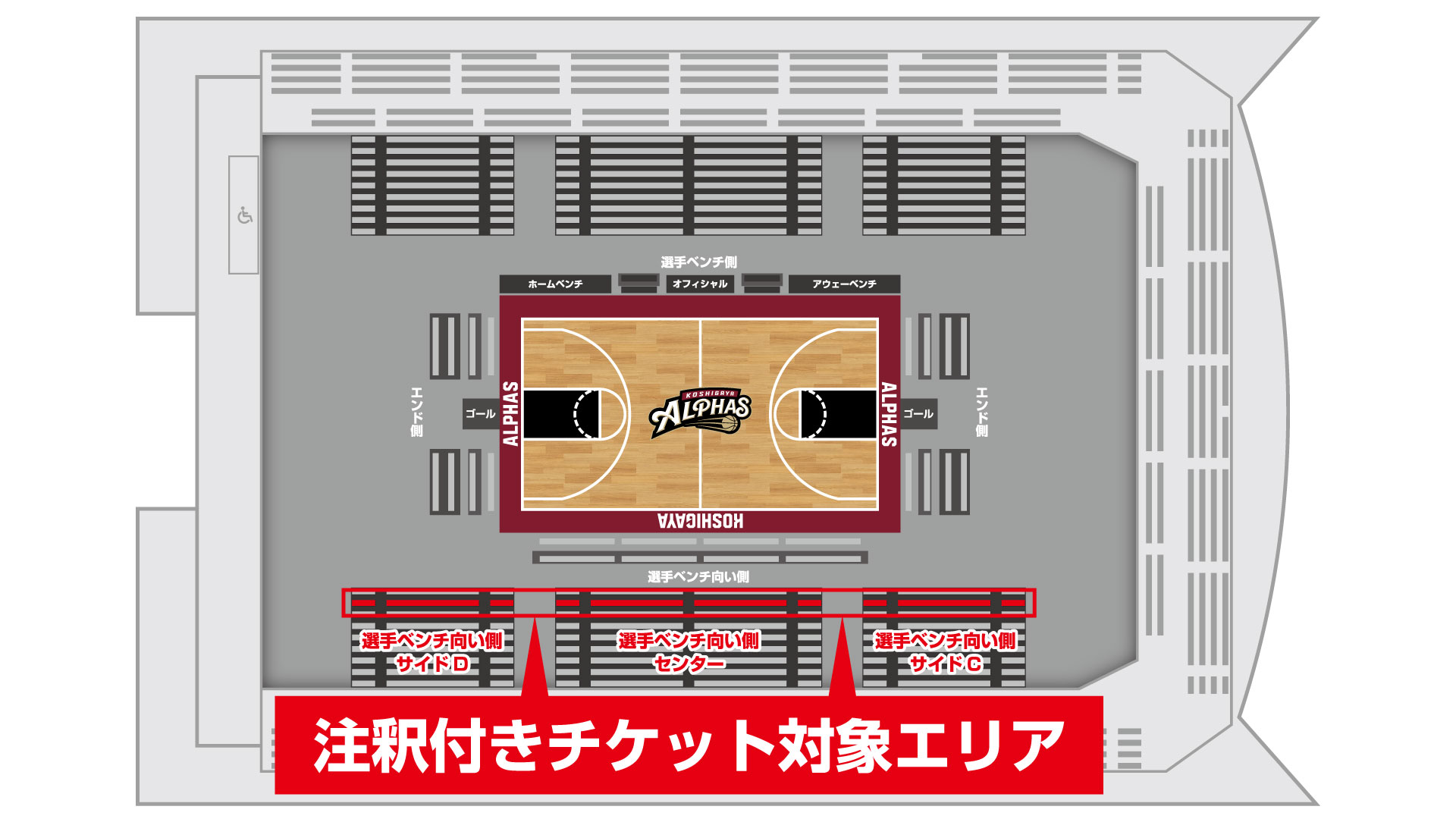 前列設置座席によりお座席からコートの一部が見えにくい可能性がございます。