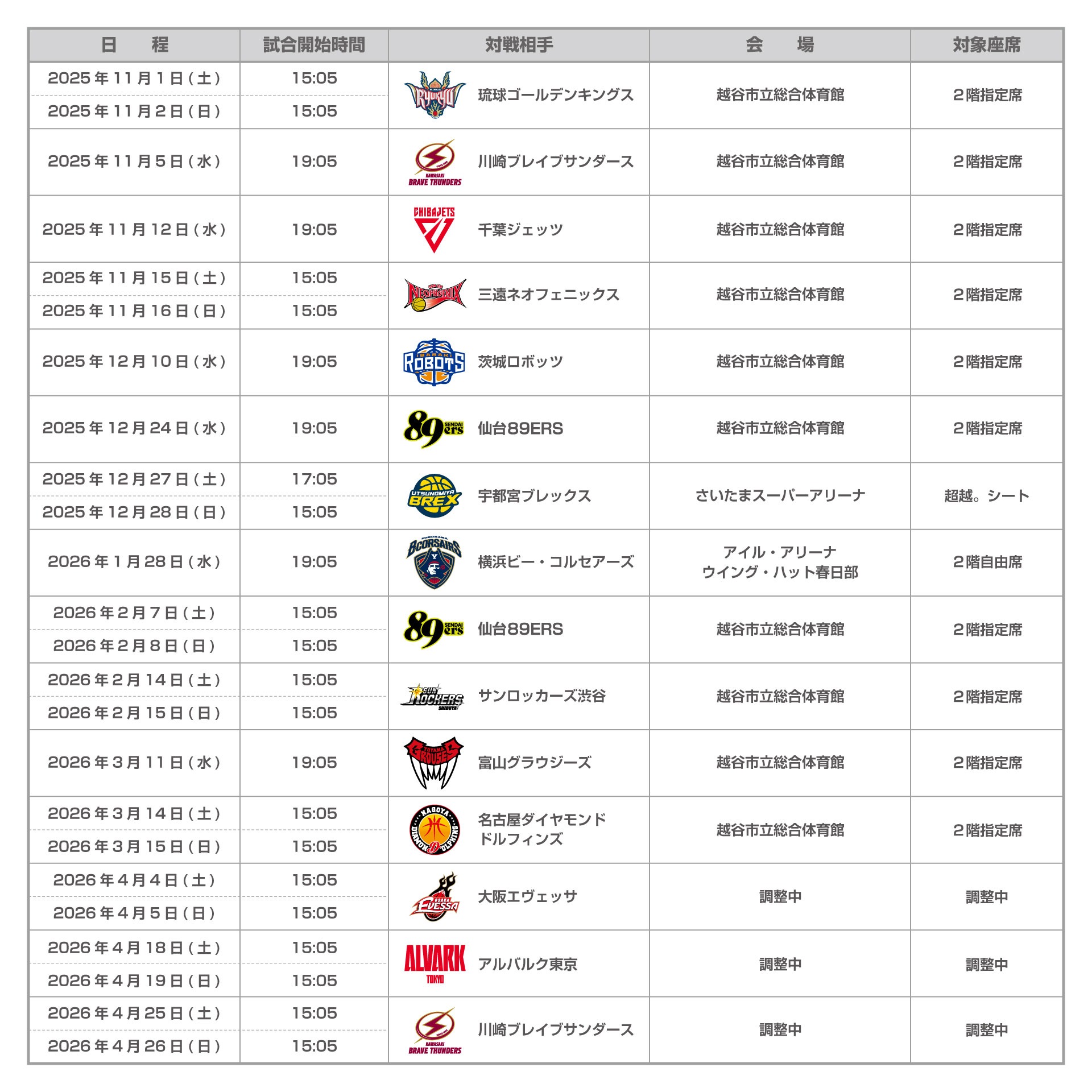 2025年11月以降の越谷アルファーズホームゲーム全24試合
