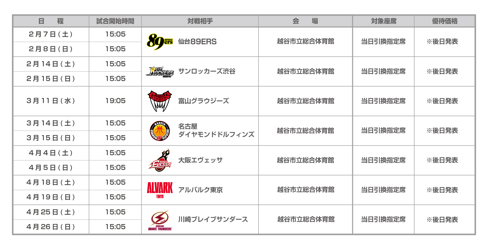 | 対 象 | 越谷市在住の小学生 ※ご同伴者様は特別価格にて、チケットをご購入いただけます。 ※特別価格は試合によって異なりますので、必ず下記スケジュールをご確認の上お申込みください。 |