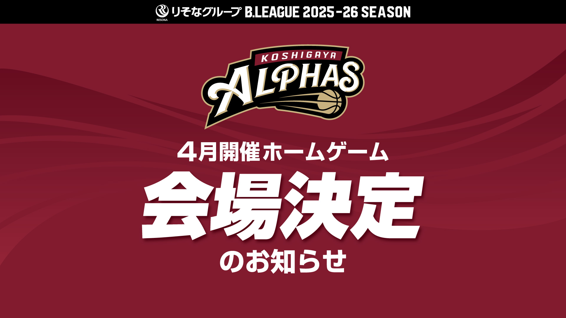 シーズン終盤となる4月に開催される『2025-26シーズン 越谷アルファーズ ホームゲーム(第29節 大阪エヴェッサ戦 / 第33節 アルバルク東京戦 / 第35節 川崎ブレイブサンダース戦)』の【開催会場】が決定いたしましたのでお知らせいたします。