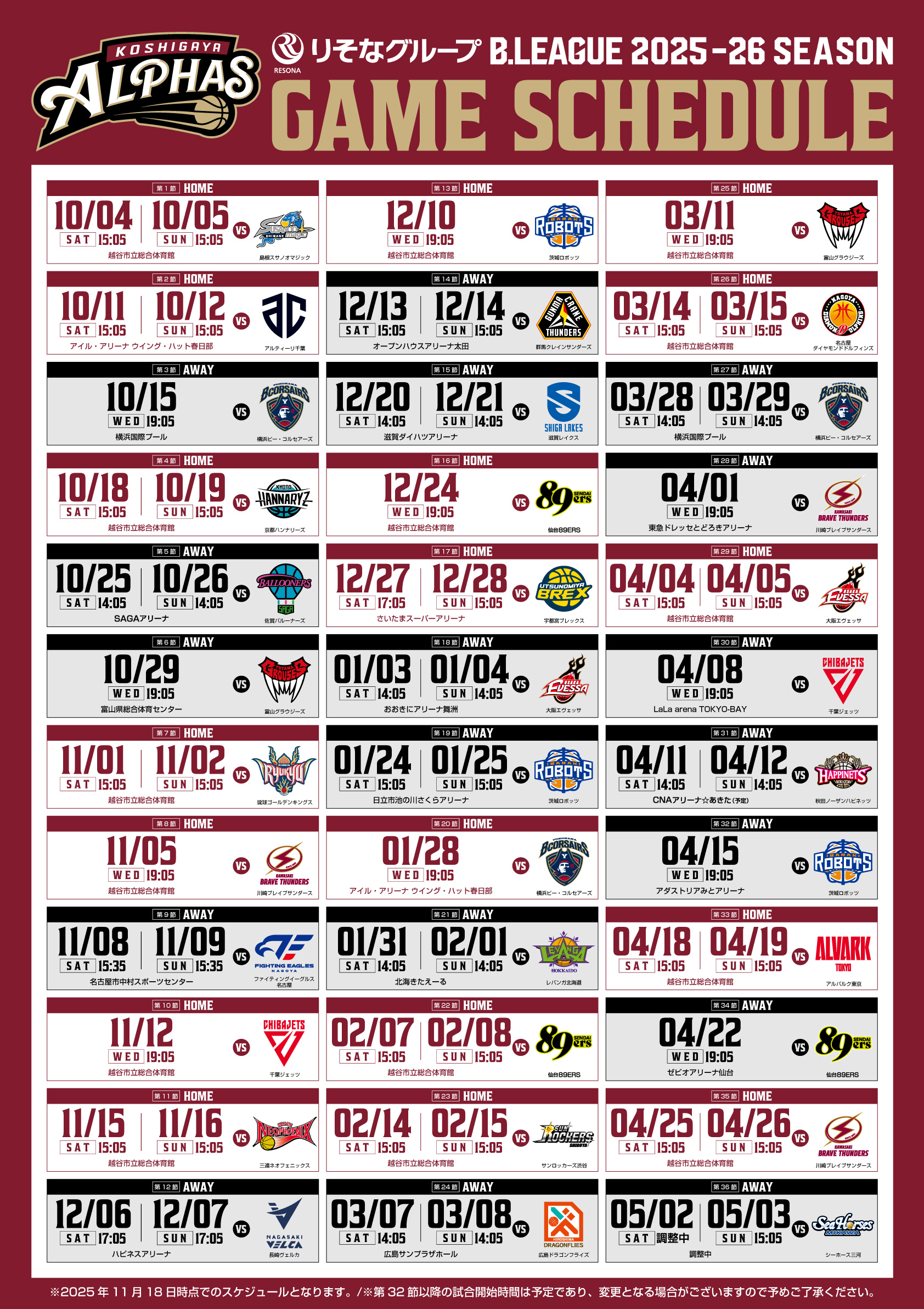 - 第35節 2026年4月25日(土)・26日(日) vs川崎ブレイブサンダース